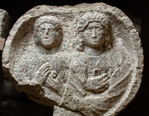 - Familie: in glattem Rahmen Brustbilder von Mutter und Sohn. Links Jüngling: bartlos, Ärmeltunica, in der Linken Frucht. Rechts Frau: severische Frisur, Tunica, Mantel, Ohrschmuck.