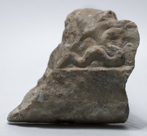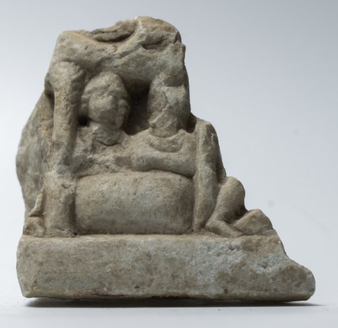 - Mythos: Fragment der Predella-Zone mit Gelage von Mithras und Sol, links und rechts Reste von weiteren Bildfeldern. Auf der Rückseite Schlange.