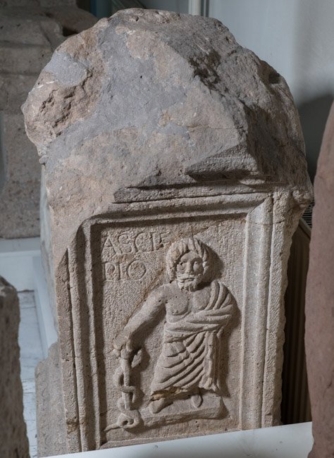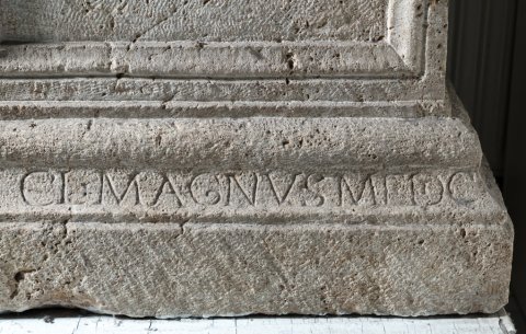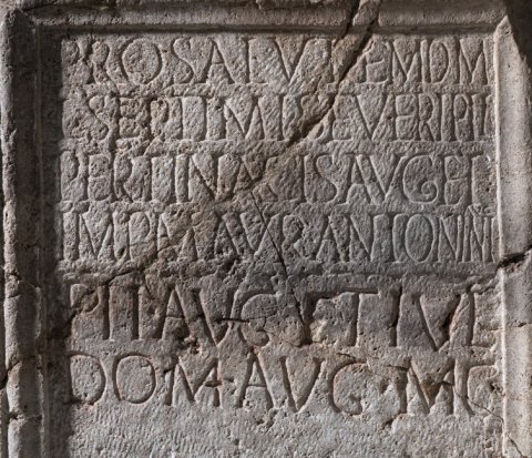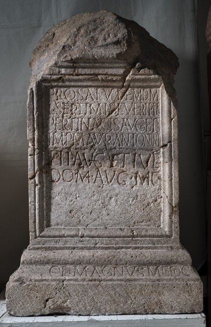 - Pro salute{m} d(omini) m(ostri)! / L(uci) Septimi Severi Pii / Pertinacis Aug(usti) et / Imp(eratoris) M(arci) Aur(eli) Antonin(i) / [[et P(ubli) Sept(imi) Getae Caes(aris)]] «Pii Aug(usti) et Iul(iae)» / «Dom(nae) Aug(ustae) m(atris) c(astrorum)» // Claudius Magnus medi(cus) // Asclepio // Hygia(e)