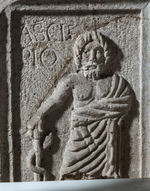 - auf den Nebenseiten mythische Figuren: rechts Asclepius, links Hygia