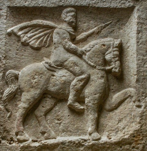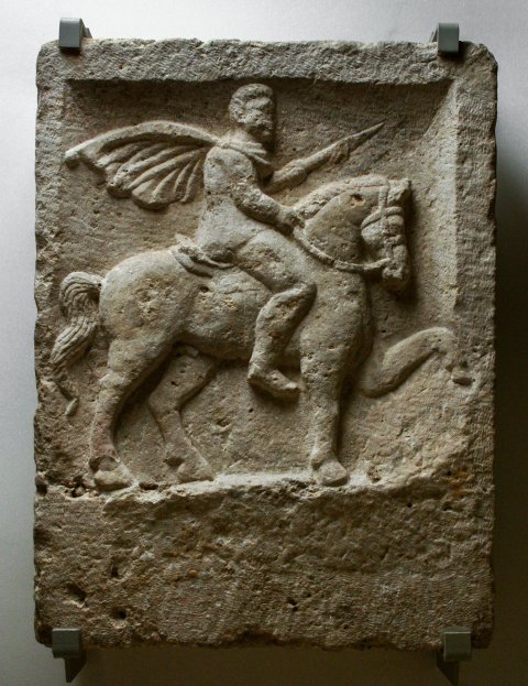 - Einfach gerahmtes Rechteckfeld mit leicht ansteigender Grundlinie. Bärtiger Reiter in Hosen, kurzer Tunica und wehendem Sagum nach rechts, im linken Arm eingelegte Lanze. Pferd gezäumt und gesattelt.