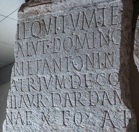 - [Mart]i equitum te[mplum] / [pro s]alut(e) domino[rum nn(ostrorum)] / [Seve]ri et Antonin[i] / [per C(aium)] Atrium Deco[ratum trib(unum)] / [coh(ortis)] II Aur(eliae) Dard(anorum) An[toni]/[nia]nae |(miliariae) eq(uitatae) A(---)E(---)[---]