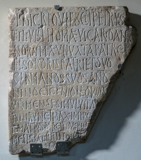 - Hic requiescit Petrus / filiu{i}s Thomae vicario an/nor{i}um XVI iuxta patre(!) / et sororis(!) patri(!) et duo(!) / germanos suos Anto/nino(!) et Gentione(!) qui in / uno mense simul vita / finirunt et maximo(!) luc/to(!) matris dereliquerunt / mens(e) Sept(embri) indict(ione) / nona XIII(?)