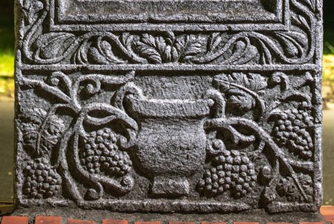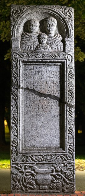 - Profilierter Bogen auf altarförmigen Postamenten, in der Nische Brustbilder einer Familie: links Mädchen (?), rechts Frau, im Vordergrund Kind. In den Eckzwickeln Palmetten. Auf den Rahmenleisten des Schriftfeldes Ranken. Sockelbild mit Krater und Weinranken.