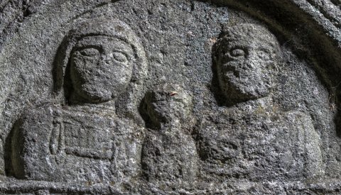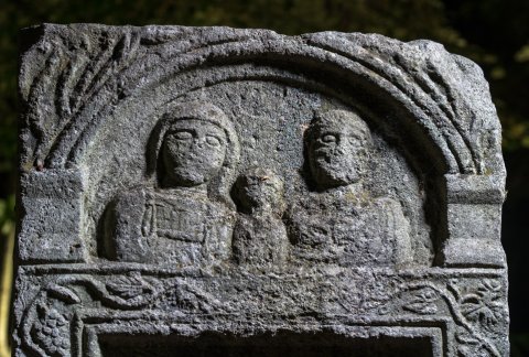 - Profilierter Bogen auf altarförmigen Postamenten, in der Nische Brustbilder einer Familie (Ehepaar mit Kind). In den Eckzwickeln Palmetten. Sockelbild mit Krater, aus dem Weinranken auf den Rahmenleisten hinaufwachsen.
