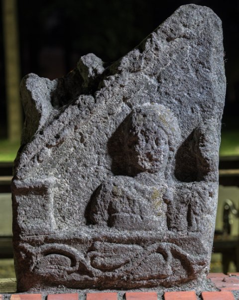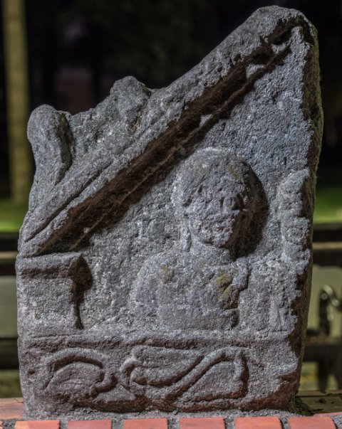 - Fragment des Stelengiebels. Auf der erhaltenen Ecke Rest eine liegenden Löwen (?). Im Giebelfeld Brustbilder einer Familie: links Frau, in der Mitte Mann im Sagum, rechts mindestens eine weitere Person. Giebelschrägen liegen auf altarförmigen Postamenten. Auf der unteren Rahmenleiste Efeuranke.