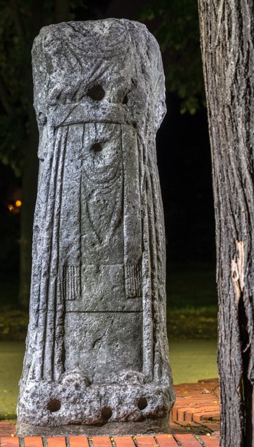 - Frontal stehende Frau (?) in langem Untergewand mit Gürtel, dessen Fransenenden bis über die Knie hängen. Vorn offenes Übergewand (Mantel ?), das seitlich in vertikalen Falten herabfällt.
