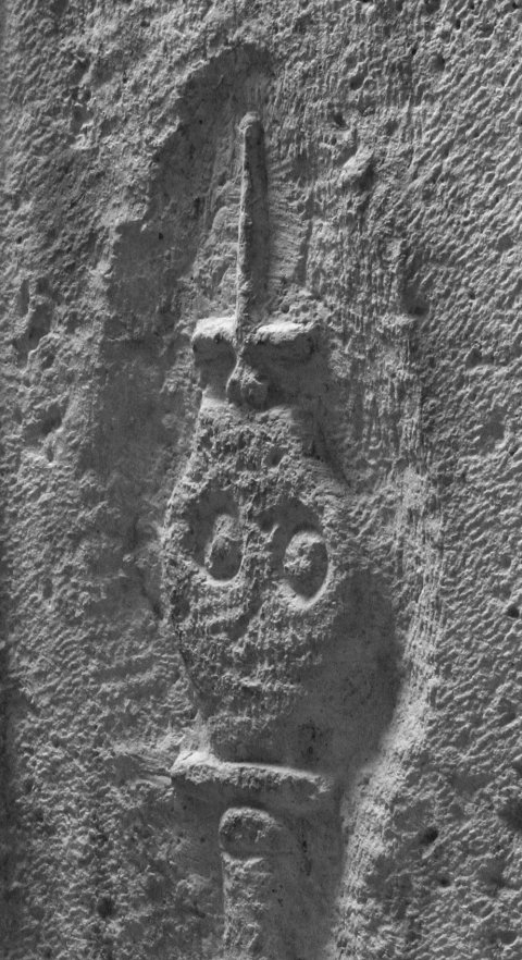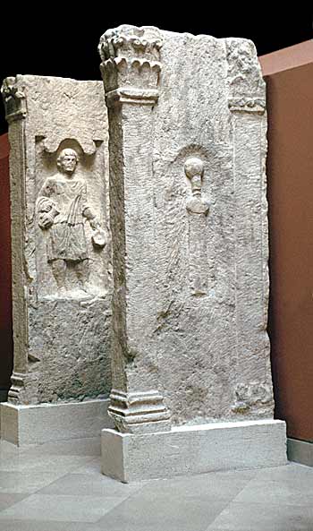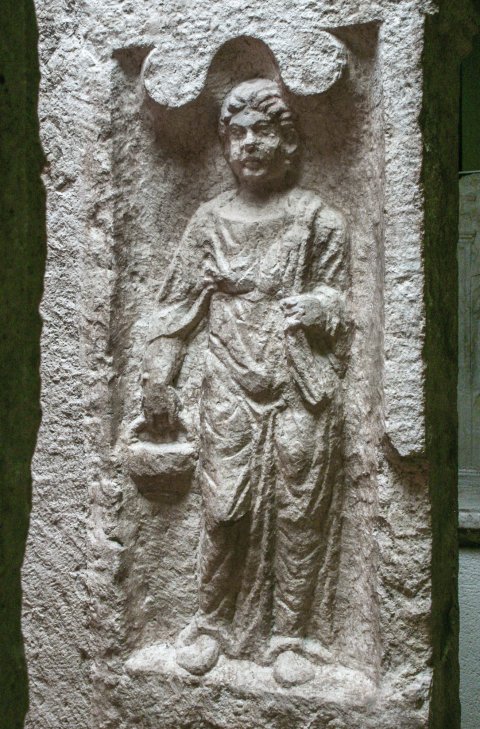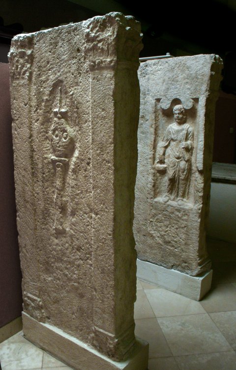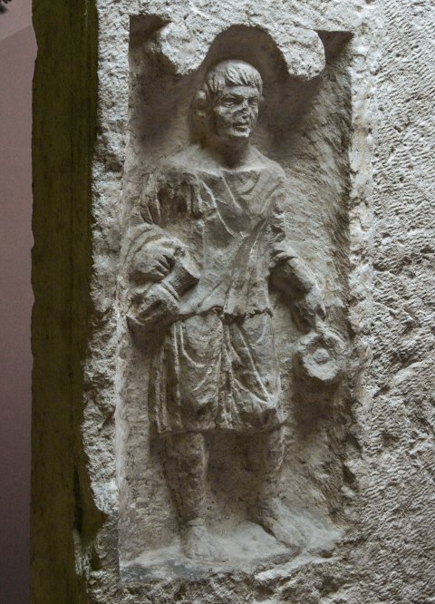 - Auf den Außenseite zwischen Pilastern Waffen (auf der rechten Seitenwange Schwert, auf der linken Beneficiarierlanze). Auf den Innenseiten Dienerin (römische Tracht, Ärmeltunica, Mantel, in der Rechten Henkelkorb) und Diener (kurze Tunica, in der Rechten Kanne, in der Linken Schale mit Griff (Patera).