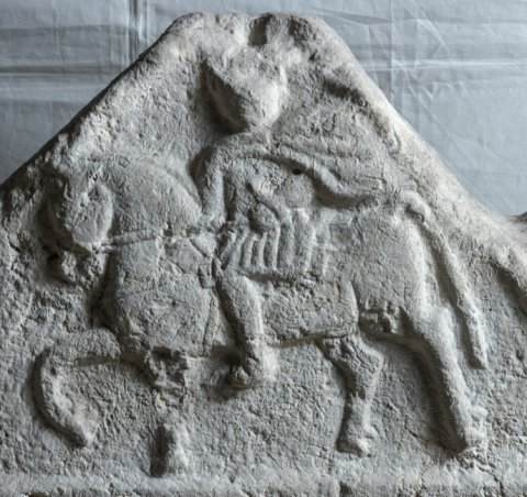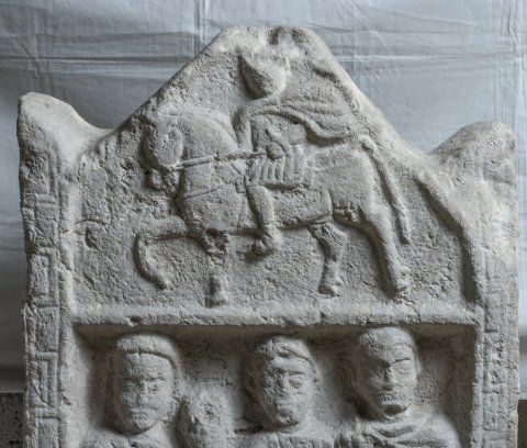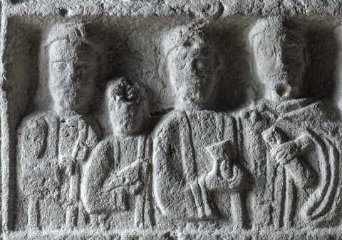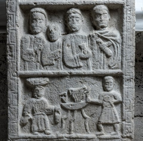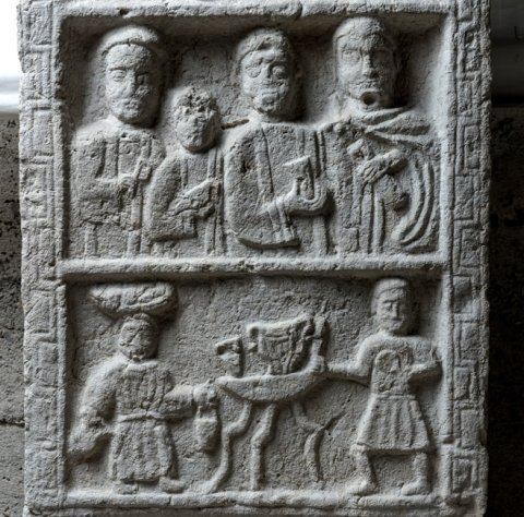 - Im Giebel Reiter, darunter zwei Bildfelder. Im oberen Halbfiguren einer Familie (von links: Frau, in der Rechten Schlüssel. Kind - Mädchen mit Vogel. Jüngling mit Becher. Alle drei in langärmigen Gewändern. Rechts bärtiger Mann im Sagum mit Armbrustfibel, in der Linken Rolle (volumen). Im unteren Bildfeld Totenopfer mit Tisch, darauf zwei Gefäße, links Dienerin mit Korb auf dem Kopf, in der Rechten Kanne, in der Linken Eimer, rechts Diener mit Becher und Schöpfkelle. Seitliche Rahmenleisten mit Mäanderornament, enden oben in Seitenakroteren. Gerahmtes Schriftfeld.