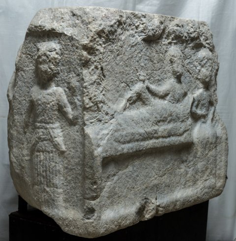 - Block mit Reliefs auf drei Seiten. Vorderseite: Totenmahl mit Mann auf Kline und am Kopfende sitzender Frau. Linke Nebenseite: stehende Dienerin mit Griffspiegel und Spindel (?). Rechte Nebenseite: stehender Mann (Diener ?) in kurzem Gewand, mit Zange (?) in der Rechten.