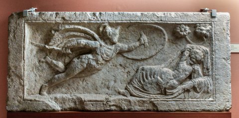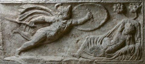 - Mythos : rechts unter Baum (zwei Zweige mit großen Blüten) schlafende Rhea Silvia mit entblößtem Oberkörper. Von links Mars heran schwebend mit wehendem Mantel, Helm, Lanze und Schild.