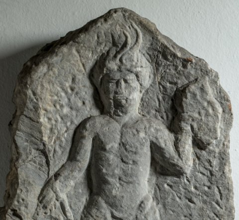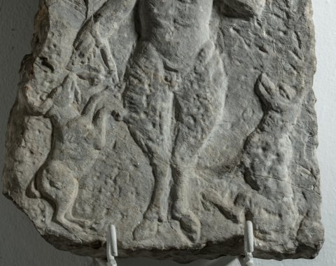 - Mythische Figur: rahmenloses Platte mit Giebelabschluss. Frontal stehender Silvanus-Pan mit Bocksbeinen, in der linken Hand Syrinx, in der rechten Pedum (?), zu beiden Seiten je ein Tier (links Ziege ?, rechts Hund).