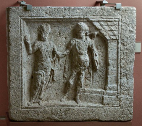 - Mythos : Theseus (nackt bis auf Mantel, Stab im linken Arm) steht vor dem Eingang zum Labyrinth, neben ihm Ariadne (Körper entblößt, Mantel über linke Schulter und um rechtes Bein, in der erhobenen Rechten Wollknäuel ?).