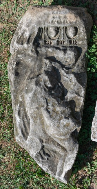 - Kampfszene ? Erkennbar ist ein nach rechts ausfallender nackter Mann mit über den Kopf erhobenem rechten Arm, hinter ihm Mantelfalten, ihn vorn überschneidend Reliefreste (angreifendes Tier ?). Am oberen Rand profilierter Rahmen mit Eierstab, an der Rückseite abgerundet. Friesfragment von einem Gebäude oder Altar ?