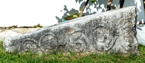 - auf der Vorderseite Spiralranken, auf den Nebenseiten Delphin (?)