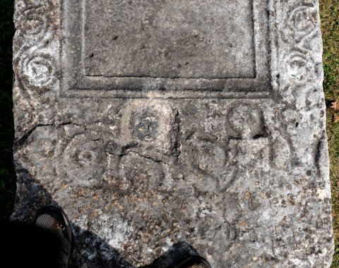 - Giebel mit Kranz (Toques ?) und drei Rosetten, Palmettenakrotere. Von Ranken gerahmtes Bildfeld mit Brustbildern von zwei Frauen mit Schleier. Auf den seitlichen Rahmenleisten des Schriftfeldes Spiralranken. Sockelbild mit Dienerin mit Kanne und Tischchen (Totenopfer).