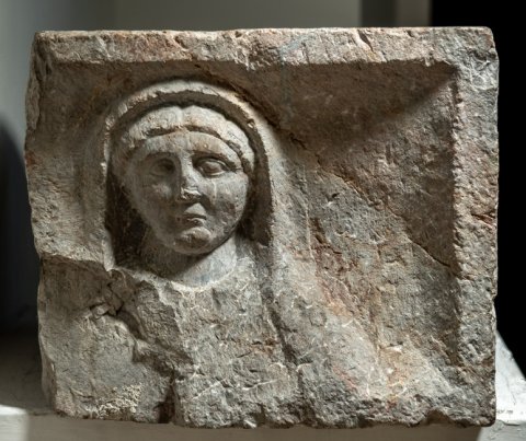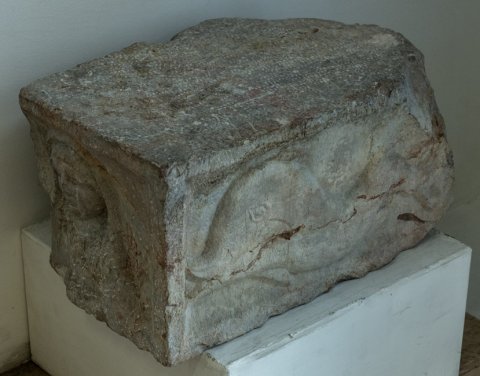 - bestoßen, vertikaler Bruch durch die Vorderseite, Rückseite tlw. abgebr., Ober- u. Unterseite geglättet
