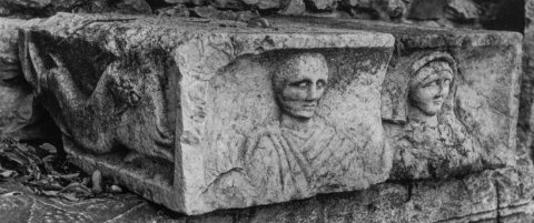 - Vorderseite: Büsten eines Paares, links bartloser Mann im Sagum mit Scheibenfibel, rechts Frau mit Schleier. Rahmen oben und seitlich. Nebenseiten: je ein Delphin, umlaufende Rahmenleiste.