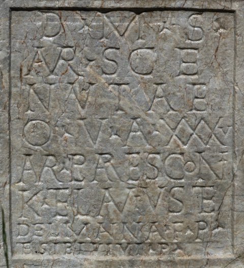 - D(is) M(anibus) s(acrum) / Aur(eliae) Sce/nutae / q(uae) v(ixit) a(nnos) XXXV / Aur(elius) Plares coni(ugi) / k(arissmae) et Lavius et / Delmanna f(iliae) p(ientissimae) / et sibi vivi p(osuerunt)