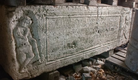 - Gerahmtes Schriftfeld zwischen Bogennischen mit nackten Knaben mit gesenkter Fackel (Trauergenius). Zwischen Nische und Inschriftrahmen stilisierter Baum mit Vogel.