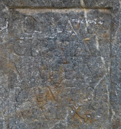 - Über dem Schriftfeld zwei Büsten (Ehepaar), links Frau mit Schleier, rechts Mann. Auf den Rahmenleisten um das Schriftfeld Ranken.