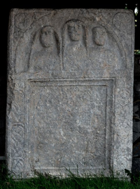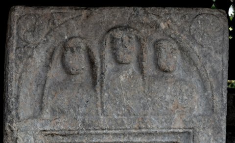 - In Bogennische drei Brustbilder einer Familie, zwei Frauen mit Schleier, rechts bärtiger Mann. In den oberen Eckzwickeln Rosetten. Gerahmtes Schriftfeld, seitliche Rahmenleisten mit Ranken.