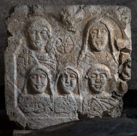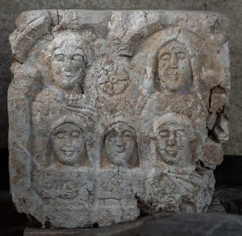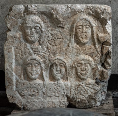 - Vorderseite: unter zwei Bögen Brustbilder einer Familie. Oben links Mann im Sagum mit Scheibenfibel, rechts Frau mit Schleier, zwischen den Köpfen Rosette. Unten drei Kinder, zwei Mädchen mit Schleier mit Frucht und Blume in der Rechten, rechts Knabe im Sagum, in der Hand Frucht. Linke Nebenseite: Reste einer männlichen (?) stehenden Figur. Rechte Nebenseite: Bogen auf Pilastern, Kopf und Schultern einer Frau mit Schleier.