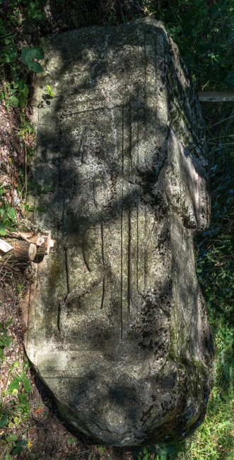 - stark verwittert u. bemoost, horizontaler Riss durch die Inschrift, Sockel abgebr.