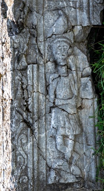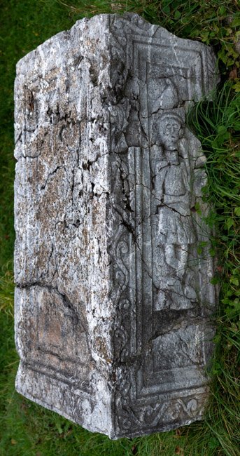 aus Fragmenten zusammengesetzt, zahlreiche Risse, Teile abgeschlagen, Sockel u. Bekrönung fehlen