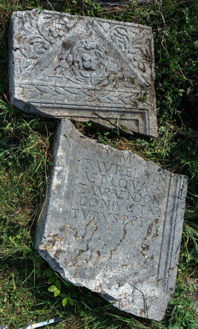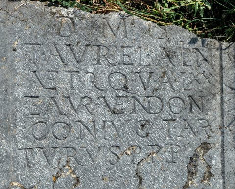 - D(is) M(anibus) s(acrum) / T(ito) Aurel(io) Aplini / vet(e?)r(ano?) q(ui) v(ixit) a(nnos) LXX / et Aur(eliae) Vendoni / coniugi T(itus) Aur(elius) / Turus p(arentibus) p(iissimis) p(osuit)