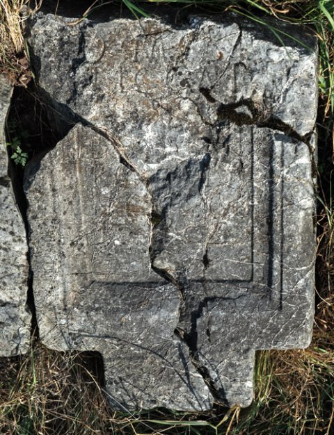 - zerbrochen, oben abgebr., große Fehlstelle in der Inschrift