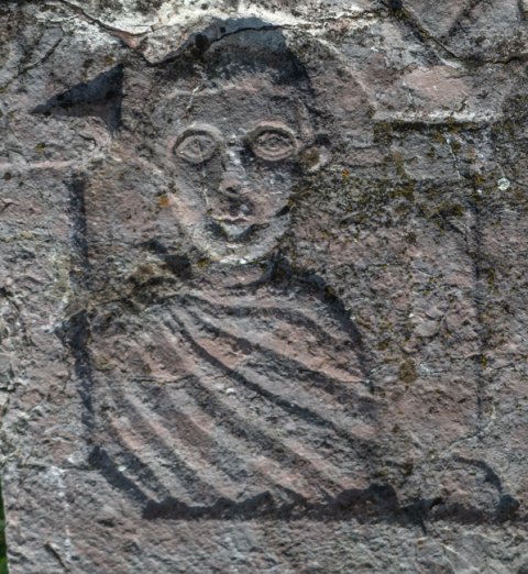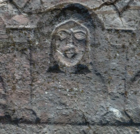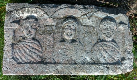 - Auf der Vorderseite drei durch Pilaster getrennte Bogennischen, darin Brustbilder einer Familie. In der Mitte Frau mit Schleier, seitlich Männer, der rechte bärtig, beide mit Sagum und Armbrustfibel.
