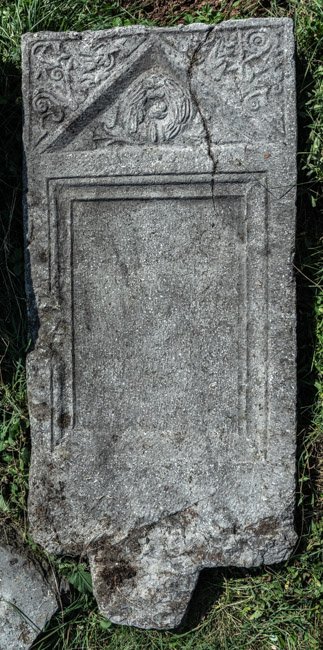 - Eingeschriebener Giebel mit Kranz, darin Rosette, seitlich Efeuzweige. In den Eckzwickeln Ranken. Gerahmtes leeres Schriftfeld.