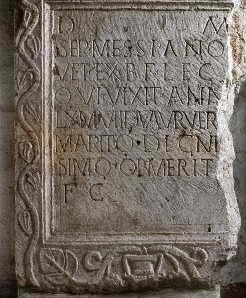 - D(is) M(anibus) / Sep(timio) Messiano / vet(erano) ex b(ene)f(iciario) leg(ati) / qui vixit ann(os) LX m(enses) VII d(ies) V Aur(elia) Ver[a] / marito digni[s]/simo ob merita / f(aciendum) c(uravit)