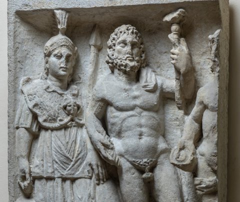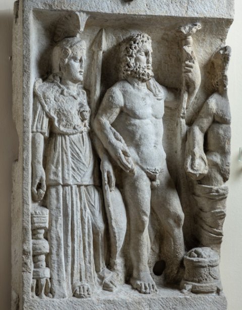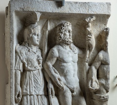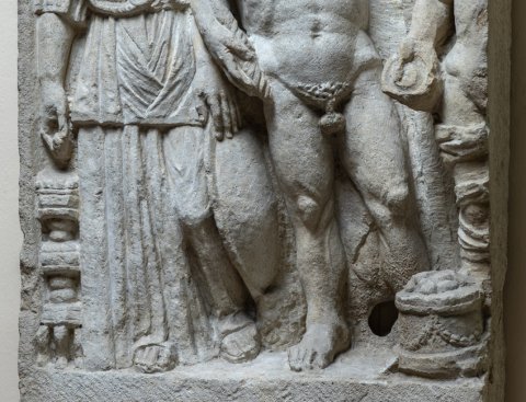 - Mythische Figuren: Rechteckiges Bildfeld mit glatten Rahmenleisten. Erhalten sind drei stehende, leicht nach rechts gewandte Gottheiten. Links Minerva mit Helm, Aegis, Schild und Lanze, die Rechte über einem Weihrauchständer (Thymiaterion). Zu ihrer Linken nackter Jupiter mit Blitzbündel und Szepter. Anschließend jugendlicher Gott (Genius) mit langen Locken, Mantel um die Beine gewickelt, in der Rechten Schale (?), neben dem rechten Fuß Ciste mit Früchten.
