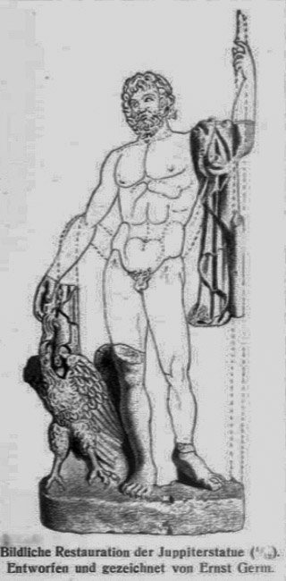 - Plinthe mit Teilen der Statue und Adler erhalten. In der Oberseite der Plinthe Klammerlöcher.