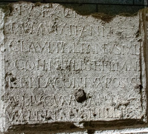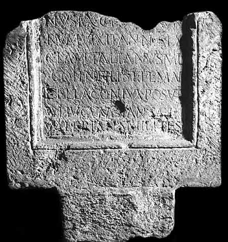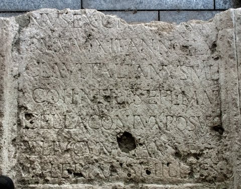 - --- vetera]/nus ex coh(orte) |(milliaria) [M]auro/rum vixit annos LX / Cla(udius) Vitalianus mil(es) / coh(ortis) n(ovae) filius et Fl(avia) Mar/cella coniux posuit / Ael(ius) Iucundianus Ael(ius) / Valerianus milites