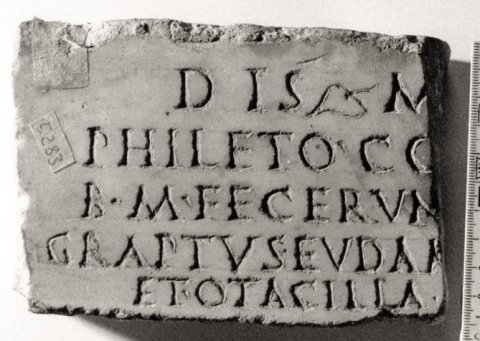- heutiger Zustand: Dis Manibus / Phileto co[nserv<o=I>] / b(ene) m(erenti) fecerun[t vix(it) a(nnos) XXV] / Graptus Eudam[us Phoebus] / et Otacilia [De(u)tera]