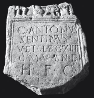 - C(aius) Antonius / Sentinus / vet(eranus) leg(ionis) XIIII / G(eminae) M(artiae) V(ictricis) an(norum) L / h(eres) f(aciendum) c(uravit) / h(ic) c(onditus)
