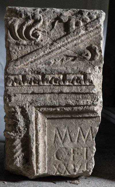 - Eingeschriebener Giebel mit vegetabilem Dekor, über den Giebelschrägen Palmetten und Ranken, unter dem unteren Giebelrahmen Kyma. Gerahmtes Schriftfeld, auf den seitlichen Rahmenleisten Ranken (?).