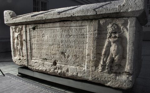 - Dachförmiger Deckel mit Akroteren. Seitlich des gerahmten Inschriftfeldes Bogennischen mit Trauergenius, auf gesenkte Fackel gestützt, in der Hand Kranz.