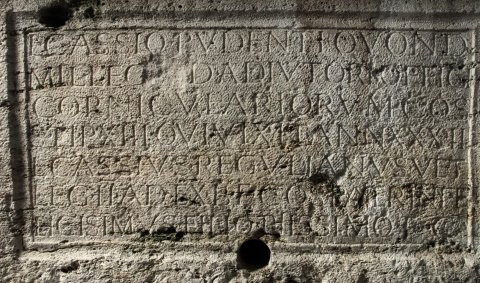 - L(ucio) Cassio Pudenti quond(am) / mil(iti) leg(ionis) II ad(iutricis) adiutori offici(i) / corniculariorum co(n)s(ularis) / stip(endiorum) XIII qui vixit ann(os) XXXII / L(ucius) Cassius Regulianus vet(eranus) / leg(ionis) II ad(iutricis) ex b(ene)f(iciario) co(n)s(ularis) pater infe/licis(s)imus filio piissimo f(aciendum) c(uravit)