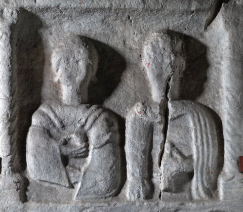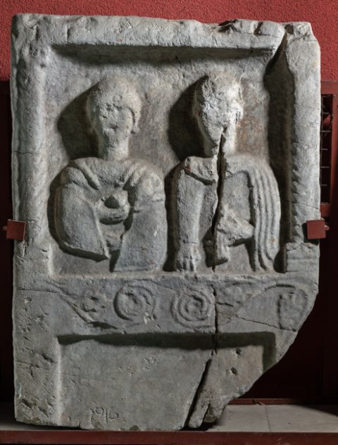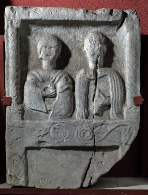 - Bildnische mit Säulen mit Spiralkanneluren. Zwei Halbfiguren (Ehepaar), links Frau in Ärmelgewand und Umhang, in der Rechten Frucht (?), rechts Mann im Sagum, Rolle (volumen) in der Linken. Auf der breiten Leiste zwischen Relief- und Schriftfeld Spiralranke.