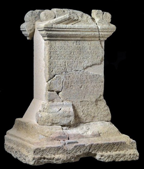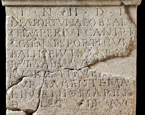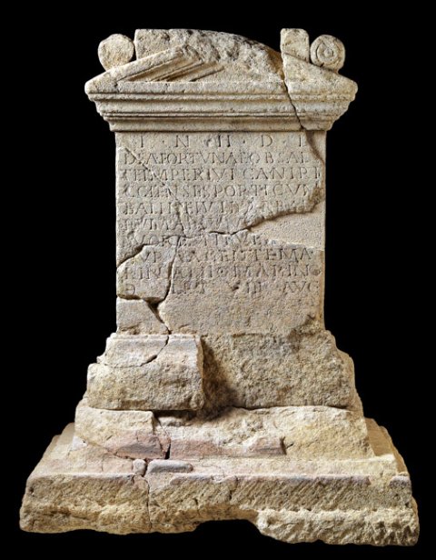- In h(onorem) d(omus) d(ivinae) / deae Fortunae ob salu/te(m) imperi(i) vicani Ri/ccienses porticum / balinei vi barbar[o]/rum absum[ptam de] / suo restituer[unt] / cura(m) agente Ma/rinianio Marino / |(centurione) leg(ionis) VIII Aug(ustae)