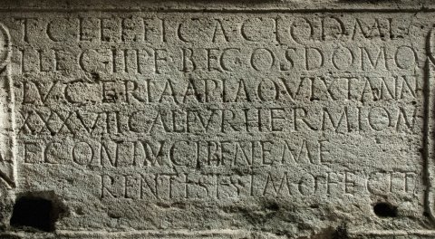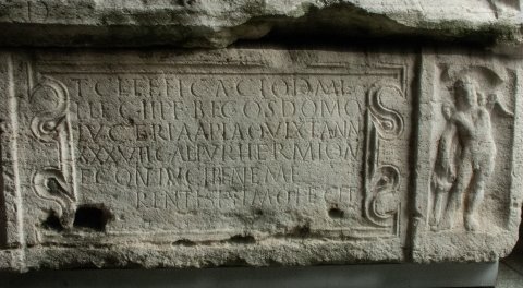 - D(is) M(anibus) // T(iberio) Cl(audio) Efficaci q(uon)d(am) mi/l(iti) leg(ionis) II (adiutricis) p(iae) f(idelis) b(ene)f(iciario) co(n)s(ulari) domo / Luceria Apia q(ui) vixit ann(os) / XXXVII Calpur(nia) Hermion/e coniugi beneme/rentissimo fecit