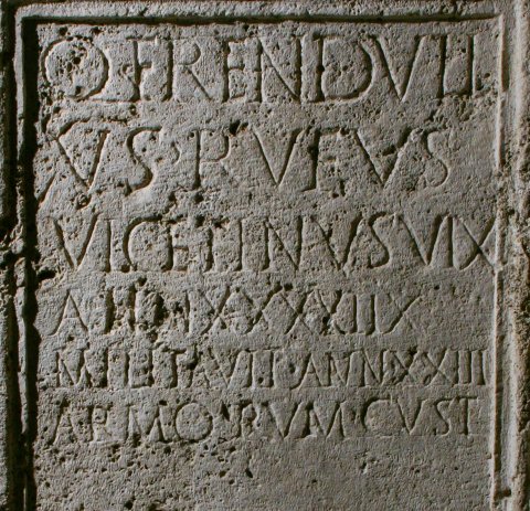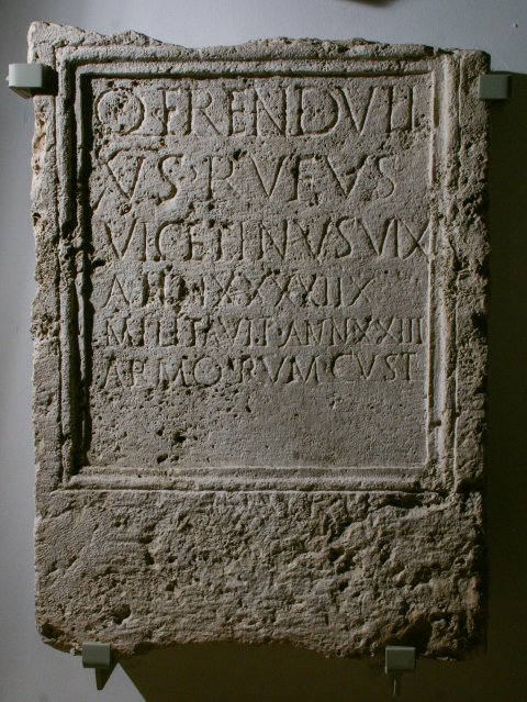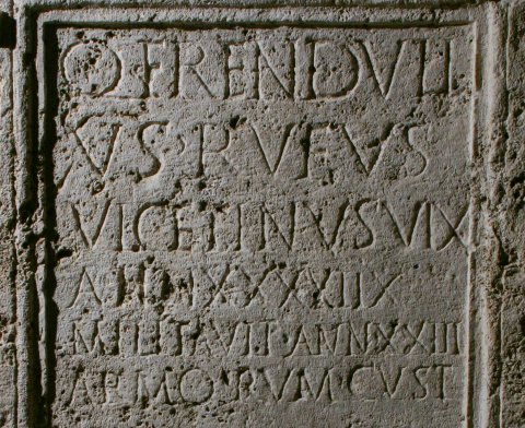 - Q(uintus) Frendull/us Rufus / Vicetinus vix(it) / ann(os) XXXXIIX / militavit ann(os) XXIII / armorum cust(os)