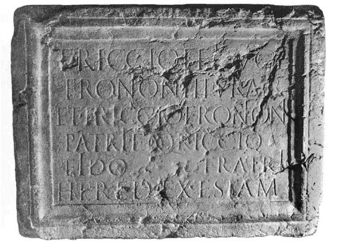- T(ito) Riccio T(iti) fil(io) Vol(tinia) / Frontoni IIvir(o) aer(arii) / et T(ito) Ricco Frontoni / patri et Q(uinto) Riccio / Fido fratri / hered(es) ex testam(ento)
