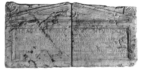 - M(arcus) Carantius Macrinus centurio coh(ortis) / primae urbanae / factus miles in ead(em) cohorte Domitiano II co(n)s(ule) / beneficiar(ius) Tettieni Sereni leg(ati) Aug(usti) Vespas(iano) (I)X co(n)s(ule) / cornicular(ius) Corneli Gallicani leg(ati) Aug(usti) equestrib(us) / stipendi(i)s Domit(iano) VIIII co(n)s(ule) item Minici Rufi legati Aug(usti) / evocatus Aug(usti) Domit(iano) XIIII co(n)s(ule) centurio Imp(eratore) Nerva II co(n)s(ule) t(estamento) p(oni) i(ussit)