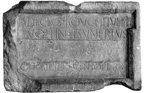 - P(ublius) Decius Troucetei Vepi f(ilius) / Voltin(ia) Esunertus / [[------]] / [[C(aio) Asinio Gallo]] / C(aio) Marcio Censorino / co(n)s(ulibus)