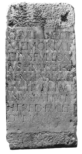 - Q(uinto) Iulio Sergio / memoriae / ei{i}us Fullon(ius) / Iustinus et Te/rentia Belatul/la et Iul(ius) Macr/inus patrono / hered(es) facien/dum curaver(unt)